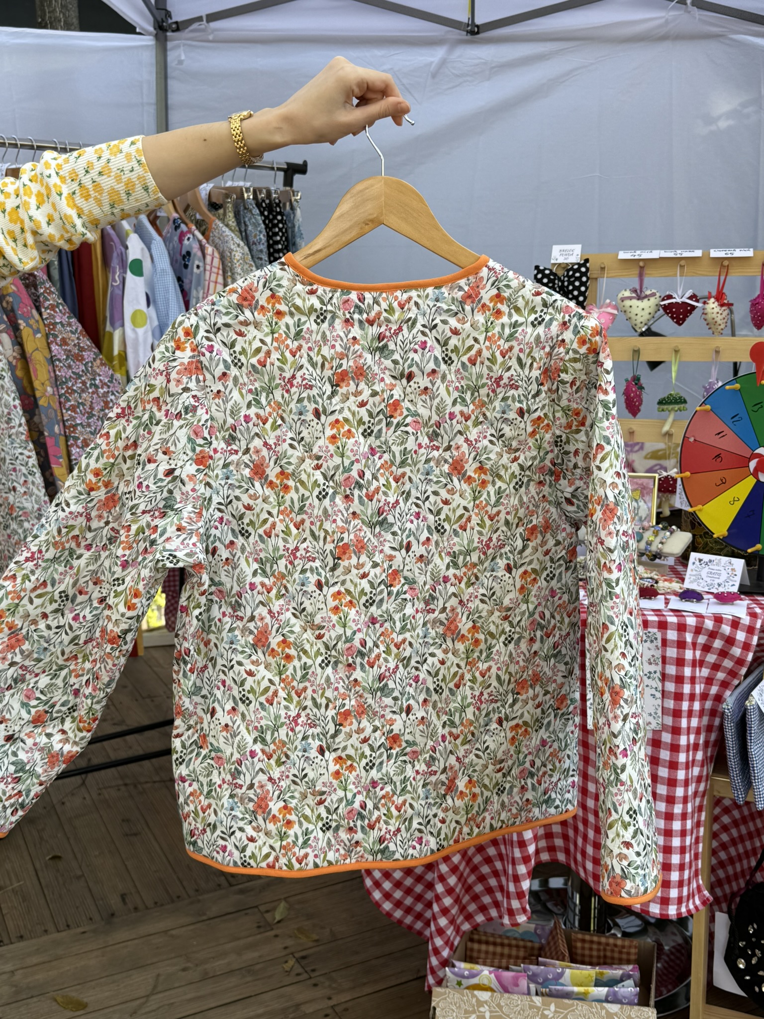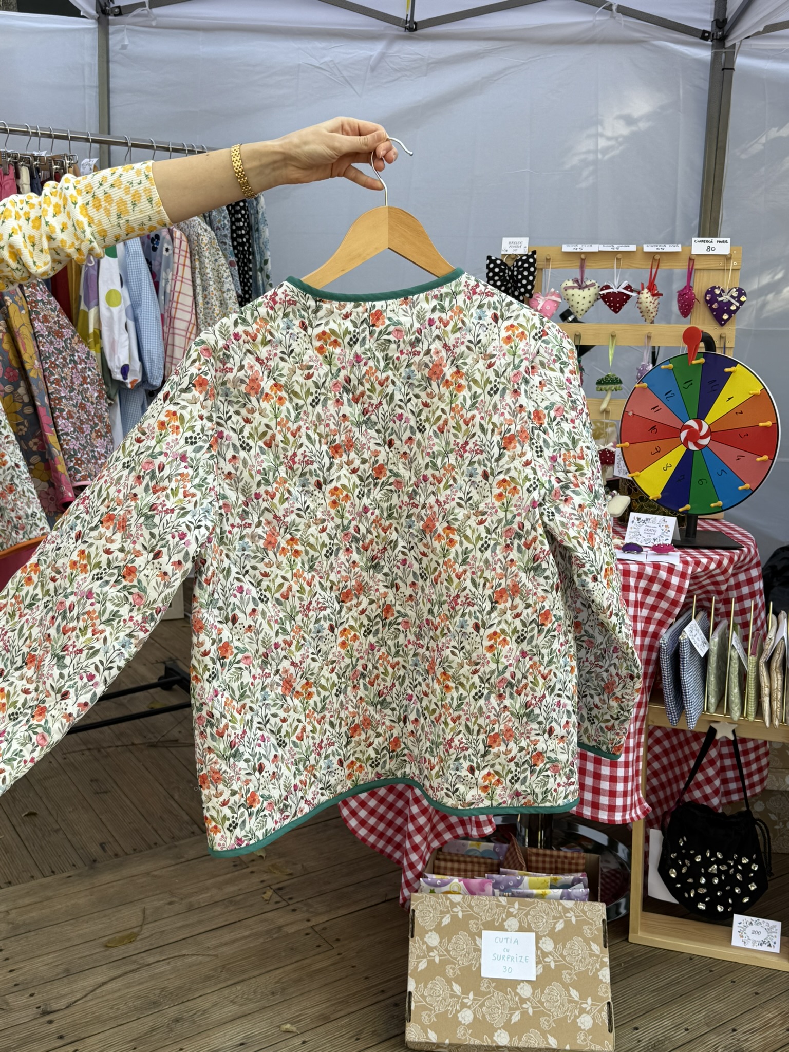 Geacă matlasată multicolor cu imprimeu floral pentru primăvară/toamnă, realizată din bumbac 100%, ideală pentru ținute feminine. Disponibilă la comandă.