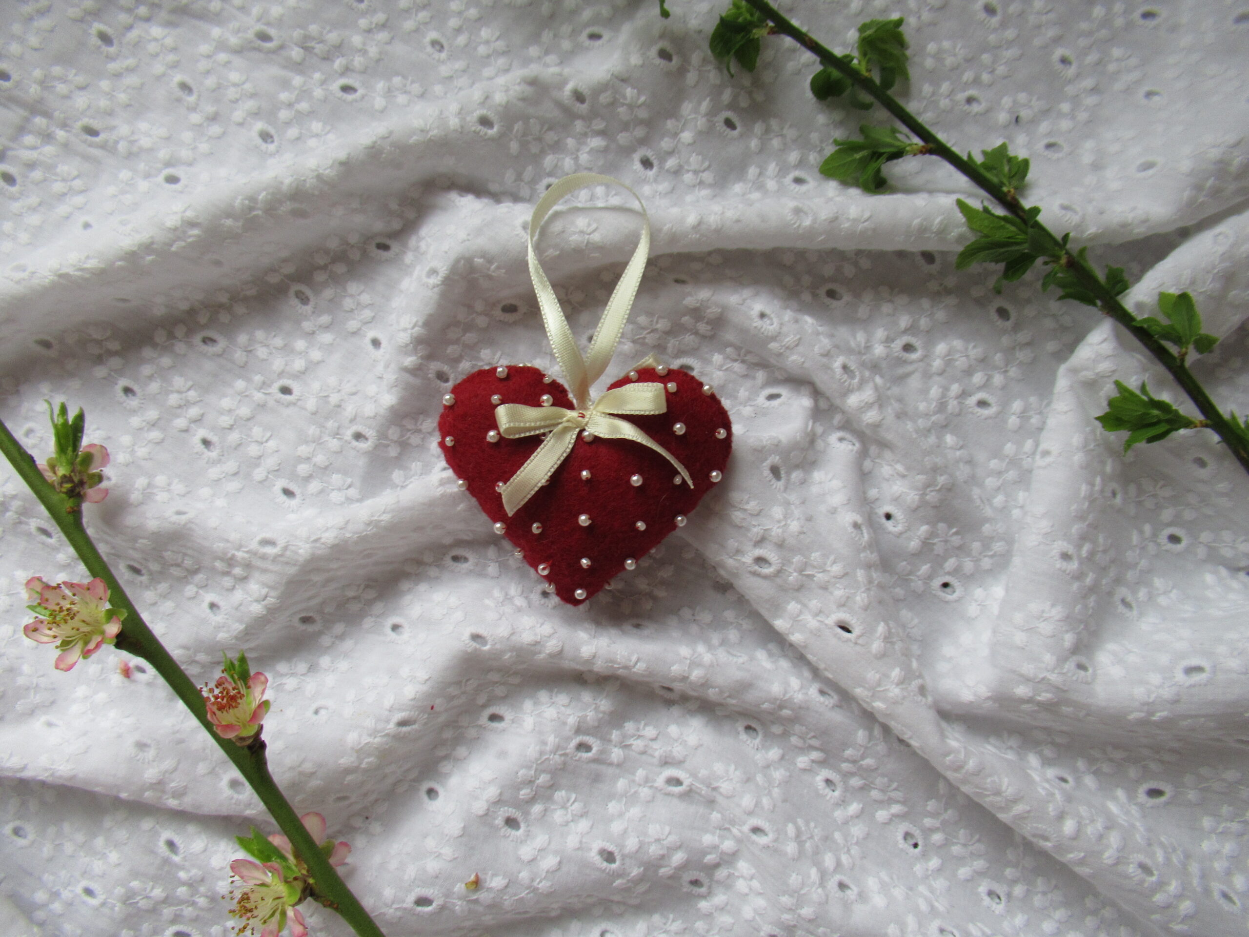 Decorațiune brodată din fetru în formă de inimă, decorată cu cristale, perle și fundiță.